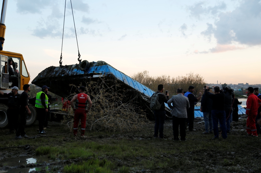 Members of the Iraqi Civil Defence rescue team lift a ferry which sank in the Tigris River with a crane in Mosul, Iraq March, 23, 2019. Picture taken March 23, 2019. REUTERS