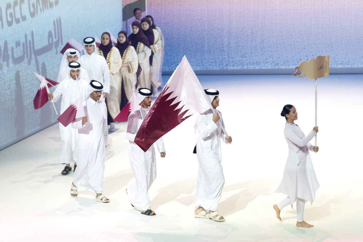 Showjumper Sheikh Mohammed bin Jassim Al Thani carries the national flag as Team Qatar athletes march during the opening ceremony. About 1500 people attended the ceremony of the Games, which kicked off on April 16 and runs through May 2.