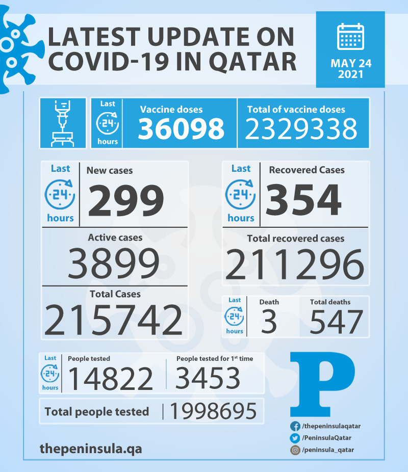 Doha: Ministry of Public Health (MoPH) today reported 299 new cases of coronavirus (Covid-19) and 354 people recovered from the virus in the last 24 hours, bringing the total number of people recovered in Qatar to 211,296.