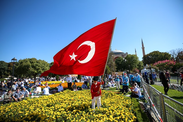 Crowds formed at checkpoints surrounding the historic heart of Istanbul, where thousands of police maintained security. On entering the secured area the worshippers, wearing face masks, sat spaced out on prayer mats in the city's Sultanahmet Square.