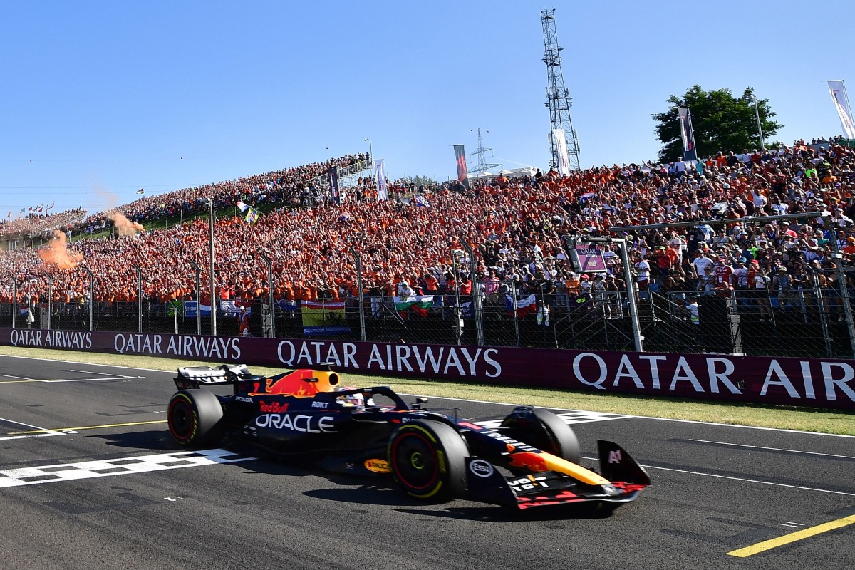 Red Bull Racing’s Dutch driver Max Verstappen crosses the finish line to win the Formula One Hungarian Grand Prix. AFP