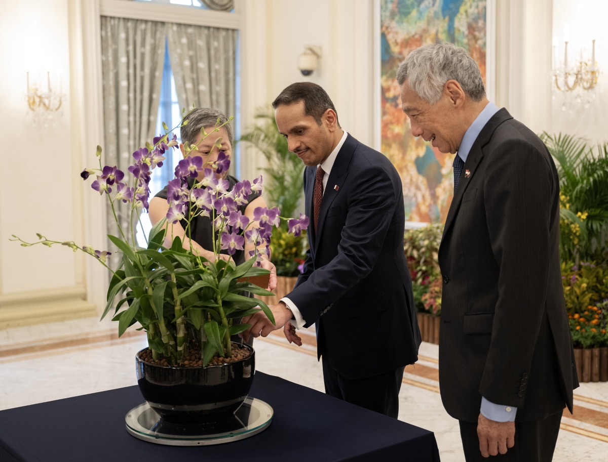 And as an expression of the depth of cooperation between the State of Qatar and the Republic of Singapore, HE the Singaporean Prime Minister gifted HE Prime Minister and Minister of Foreign Affairs a Singaporean orchid during the ceremony naming one of the famous types of flower bearing the names of a number of senior official guests after His Excellency.