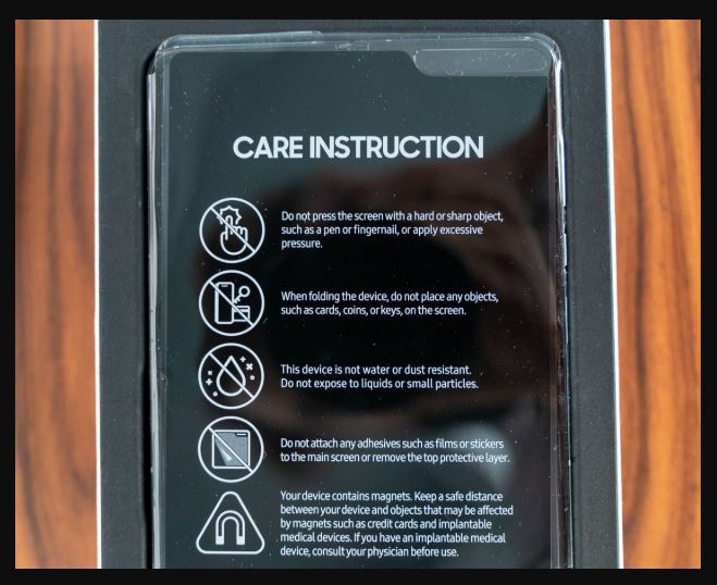 When you unbox Samsung's Galaxy Fold, a sticker on the front of the phone lists many ways you might inadvertently damage it. Pic: Washington Post photo by James Pace-Cornsilk