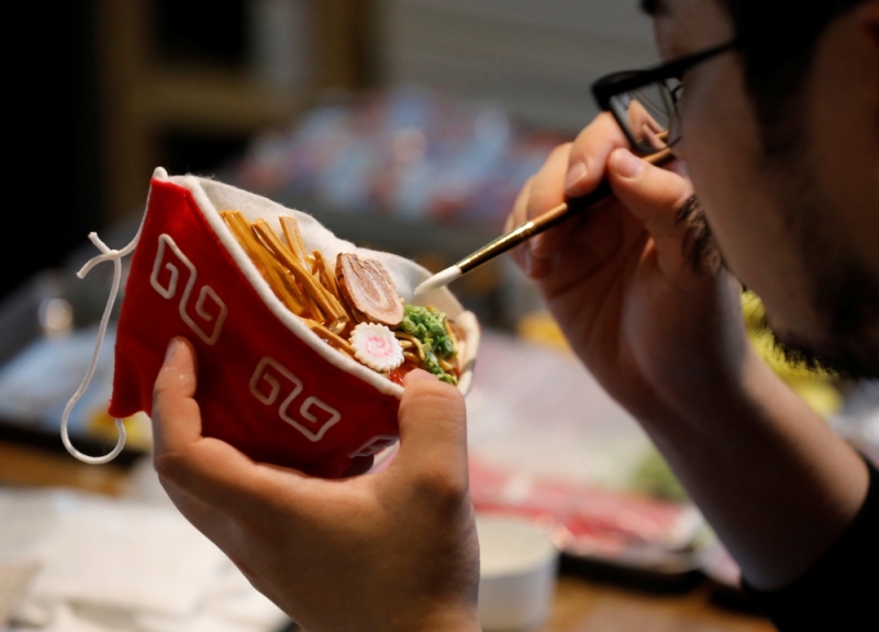 The 3D ramen mask, made from felt and clay, has everything you'd want in a real bowl of the noodle soup. Shibata's nose disappears into chashu braised pork, green onions, bamboo shoots, and a slice of fish cake.