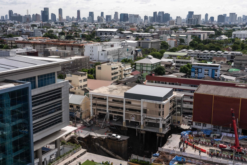A vehicle is seen on the edge of a hole in the ground after a road collapsed near a hospital in Bangkok on September 24, 2025. (Photo by Chanakarn Laosarakham / AFP)