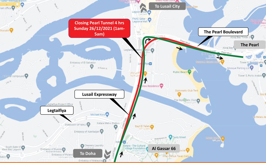 Doha: Ashghal has announced a four-hour closure of Pearl tunnel towards Pearl for traffic coming from Al Ghassar Interchange, effective on Sunday from 1am to 5am to enable some maintenance works. During the closure, road users will be shifted to the light signals on Pearl Interchange to reach their destinations.