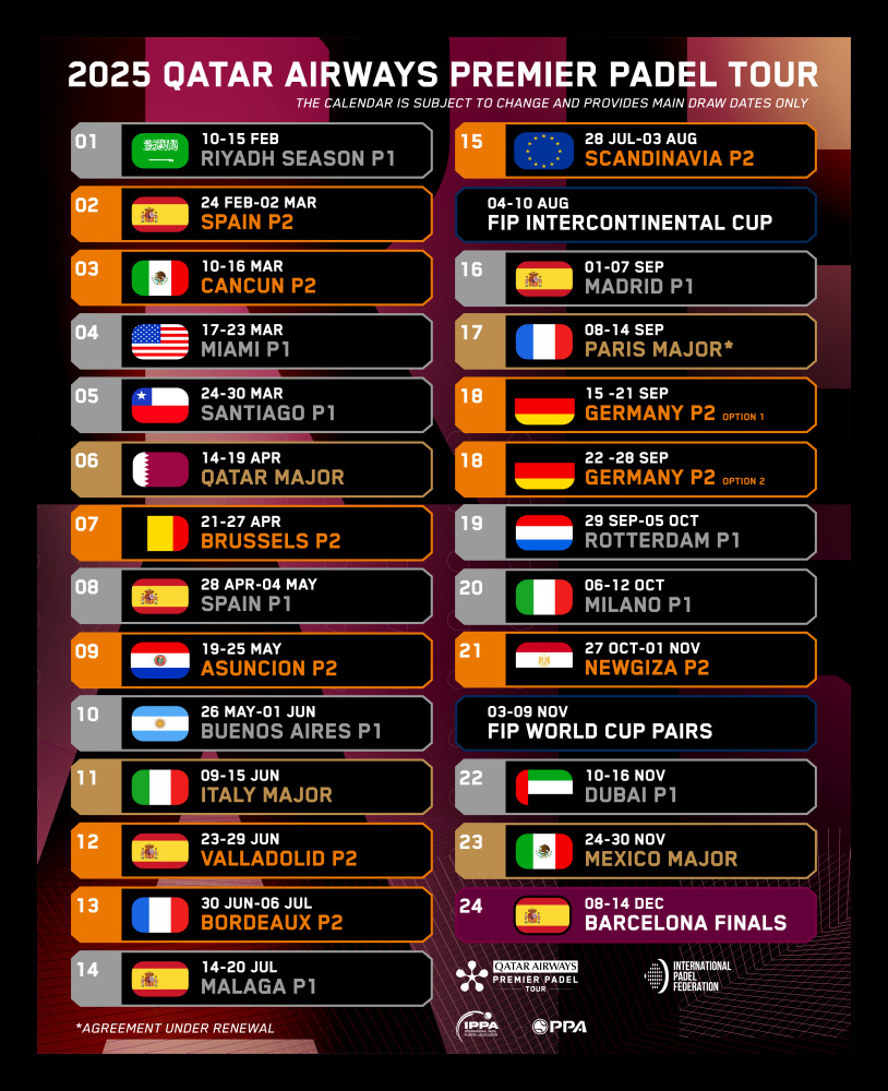 Premier Padel Chairman Nasser Al Khelaifi said: “We are very proud to announce Premier Padel’s fantastic 2025 calendar, as we continue to propel the sport to new frontiers and take all aspects of the professional tour to the highest level. The 2025 calendar – developed in partnership with players and partners – shows our clear commitment to accelerate the global growth of padel and provide new and existing fans and players with an incredible experience of the Tour for many years.”