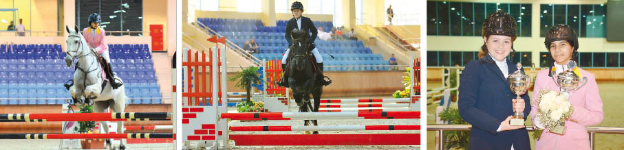 Vrome, ridden by Haya Mohammed Al Marri storms to win the Class 2 at the 4th Future Riders Show Jumping Championship – 2016 in Doha yesterday. Lebardo, ridden by Saif Alla Tamer was placed second ahead of third placed Abdulrahman Hamad Saeed who rode Bel Rose. CENTRE: Mari Bill, ridden by Ashley Di Agosino, clearing a hurdle on her way to win the Class 1. Ali Al Sharashini who rode Wendefi came in second, followed by Tamim Nasser Al Qadi who rode Rose D’en Hue. RIGHT: The two winners pose with their cups.
