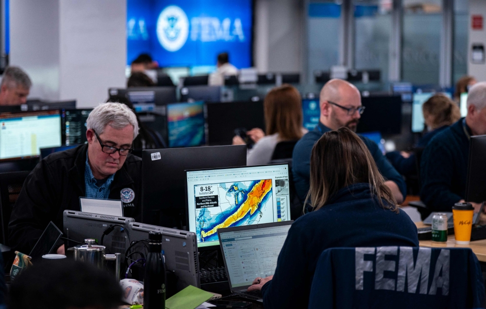A worker in the National Response Coordination Center looks at a map of the approaching winter storm at FEMA on January 24, 2026 in Washington, DC. Al Drago/Getty Images/AFP
