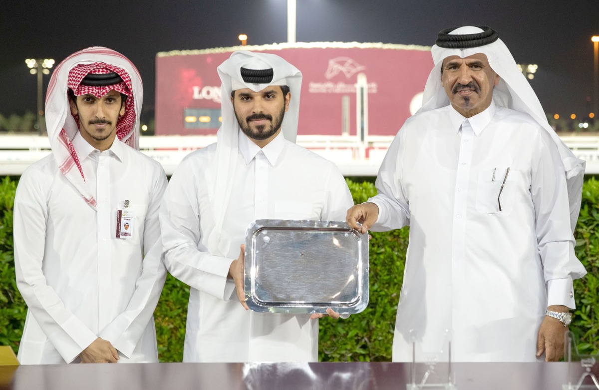 Qatar Chamber's First Vice-Chairman Mohammed bin Ahmed Twar Al Kuwari presents the winner's trophy to the connection of Ridicule (IRE) (Dandy Man) after Al Gaiah Racing’s 2YO ward clinched the Al Ghashamiah Cup, the feature race of the 13th Race Meeting at Al Rayyan Racecourse, yesterday.