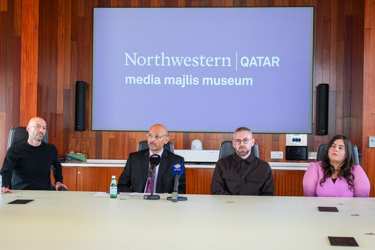 Director of The Media Majlis Museum Alfredo Cramerotti; NU-Q Dean and CEO Marwan M. Kraidy; Curator Jack Thomas Taylor; and Assistant Curator Amal Zeyad Ali are addressing the media at a press preview event.