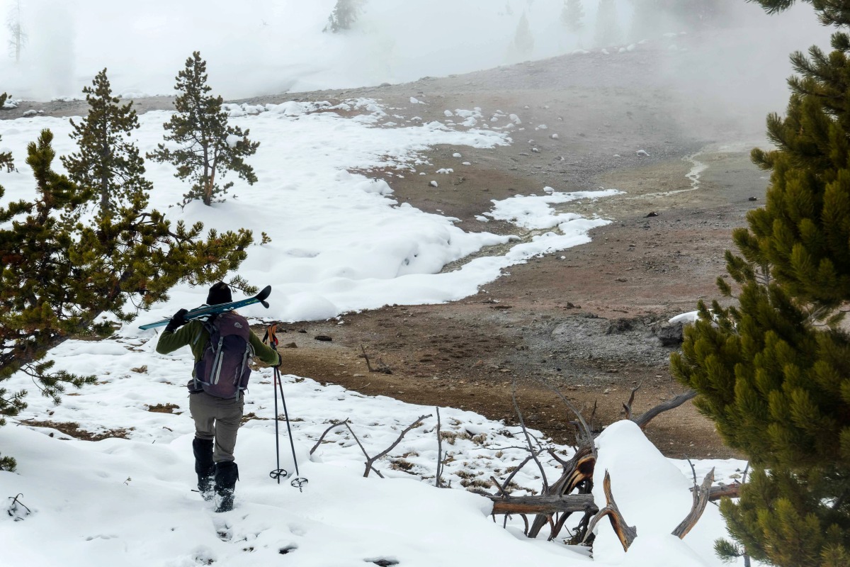 A Yellowstone Expeditions guide carries skis near Violet Springs. Photo for The Washington Post by Dina Mishev