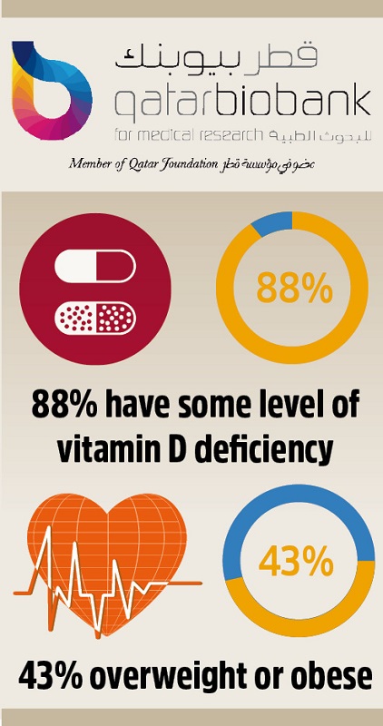 Doha: High prevalence of obesity and vitamin D deficiency has been found in Qatari population, according to Qatar Biobank report 2018/19 released yesterday. About 43 percent were found overweight or obese and 88 percent have some level of vitamin D deficiency.
