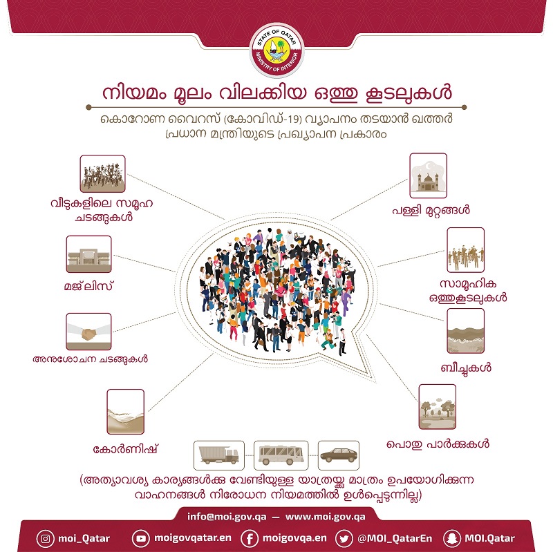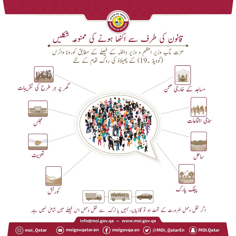 “The prohibited forms of gathering include social functions at homes, majlis, mourning, Corniche, courtyards of mosques, social gatherings, beaches and public parks,” the Ministry said.