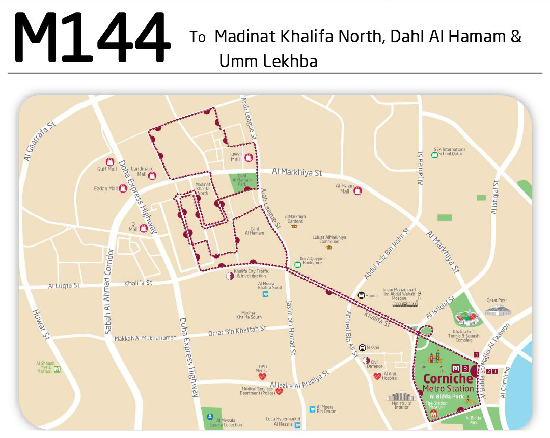 Starting tomorrow, April 27, 2025, the new bus route M144 will be operating from Corniche station to serve Madinat Khalifa North, Dahl Al Hamam, and Umm Lekhba areas.