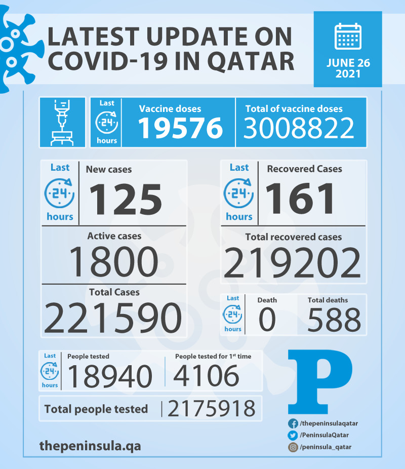 Doha: Ministry of Public Health (MoPH) today reported 125 new cases of coronavirus (Covid-19) and 161 people recovered from the virus in the last 24 hours, bringing the total number of people recovered in Qatar to 219,202.