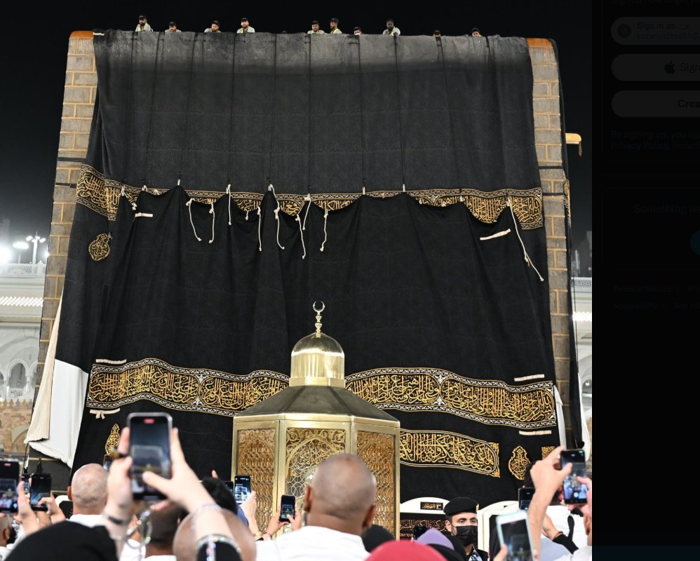 The new Kiswa, weighing 1,415 kilograms and measuring 14 meters, has been installed. It consists of four separate sides and the curtain of the door.