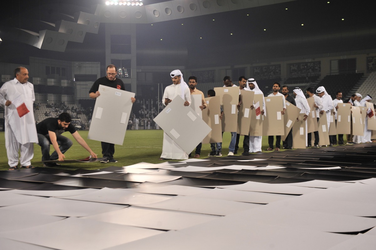Citizens and residents taking part in creating ‘Tamim Al Majd’ image at Al Sadd stadium yesterday. Pic: Baher Amin / The Peninsula