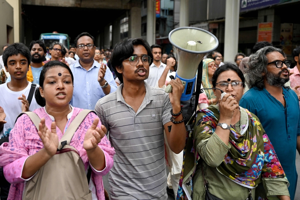 People take part in a song march to protest against the indiscriminate killings and mass arrest in Dhaka on July 26, 2024. (Photo by Munir Uz Zaman / AFP)