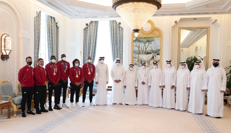 Doha: The Amir HH Sheikh Tamim bin Hamad Al Thani received at the Amiri Diwan today morning, the delegation of Qatar's team crowned with two gold medals in the High Jump and Weightlifting, and a bronze medal in Beach Volleyball at the Summer Olympics - Tokyo 2020.