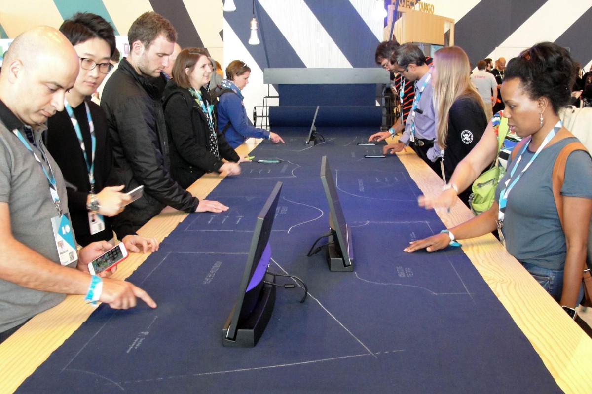 People touch specially woven Project Jacquard fabric in the hands of Advanced Technology and Projects team at Google annual developers conference in San Francisco, May 29, 2015 (AFP / Glenn Chapman)