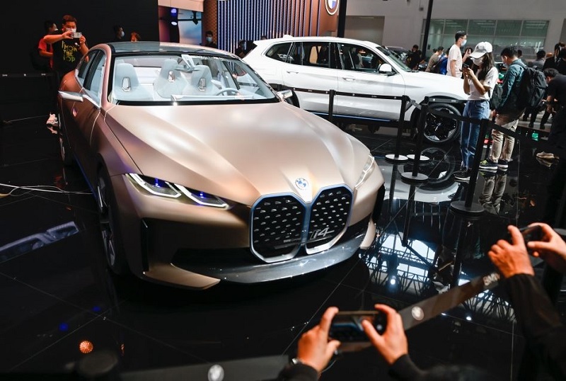 People take photos of a BMW concept i4 car displayed at the Beijing Auto Show in Beijing on September 26, 2020. / AFP / WANG Zhao