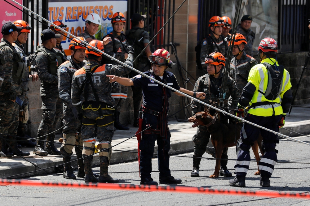 Soldiers and rescue workers secure a rescue dog before descending into a sinkhole opened by the rains, in Villa Nueva, in Guatemala City, Guatemala, September 25, 2022. (REUTERS/Luis Echeverria)