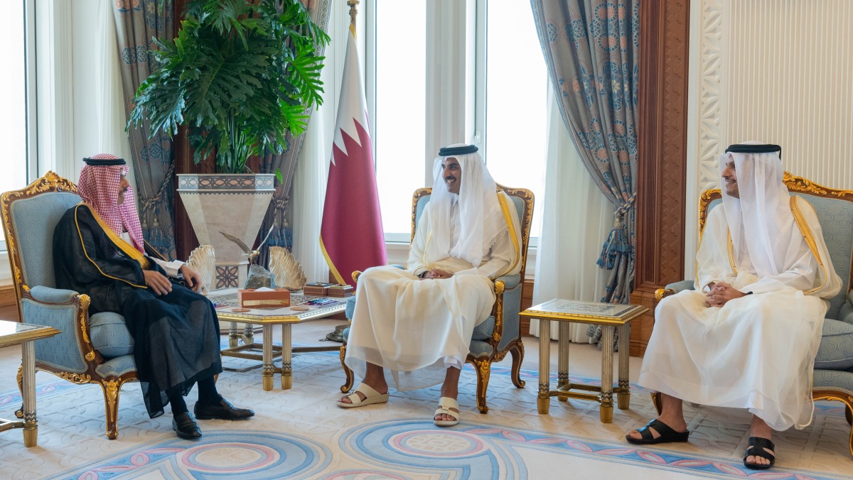 Doha, Qatar: The Amir HH Sheikh Tamim bin Hamad Al-Thani met at his Amiri Diwan office on Tuesday morning with the Minister of Foreign Affairs of the sisterly Kingdom of Saudi Arabia HH Prince Faisal bin Farhan bin Abdullah Al Saud, and the accompanying delegation, on the occasion of his visit to the country.