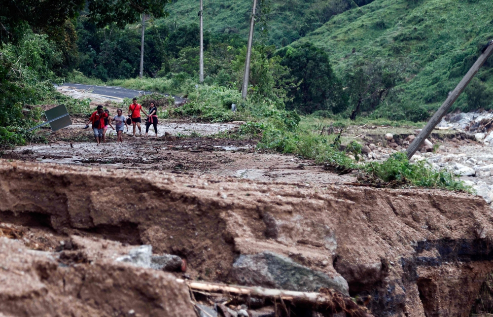 People walk along a road which was destroyed and washed away at the Kilometro 42 community, near Acapulco, Guerrero State, Mexico, after the passage of Hurricane Otis, on October 25, 2023. Photo by Rodrigo OROPEZA / AFP