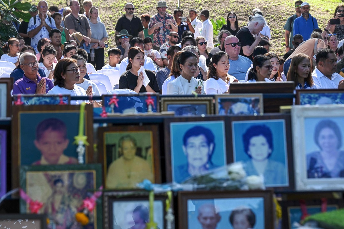 People take part in an interfaith ceremony next to portraits of tsunami victims at the Ban Nam Khem Tsunami Memorial Park in southern Thai province of Phang Nga on December 26, 2024. Photo by Lillian SUWANRUMPHA / AFP