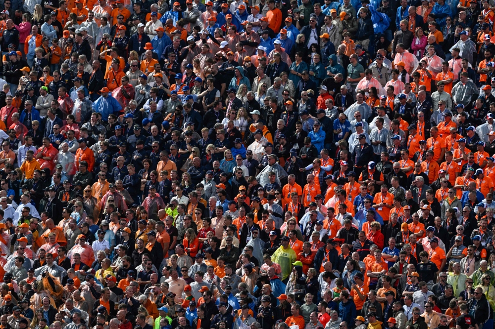 Spectators watch the qualifying session at The Circuit Zandvoort, ahead of the Dutch Formula One Grand Prix, in Zandvoort on August 26, 2023. Photo by JOHN THYS / AFP