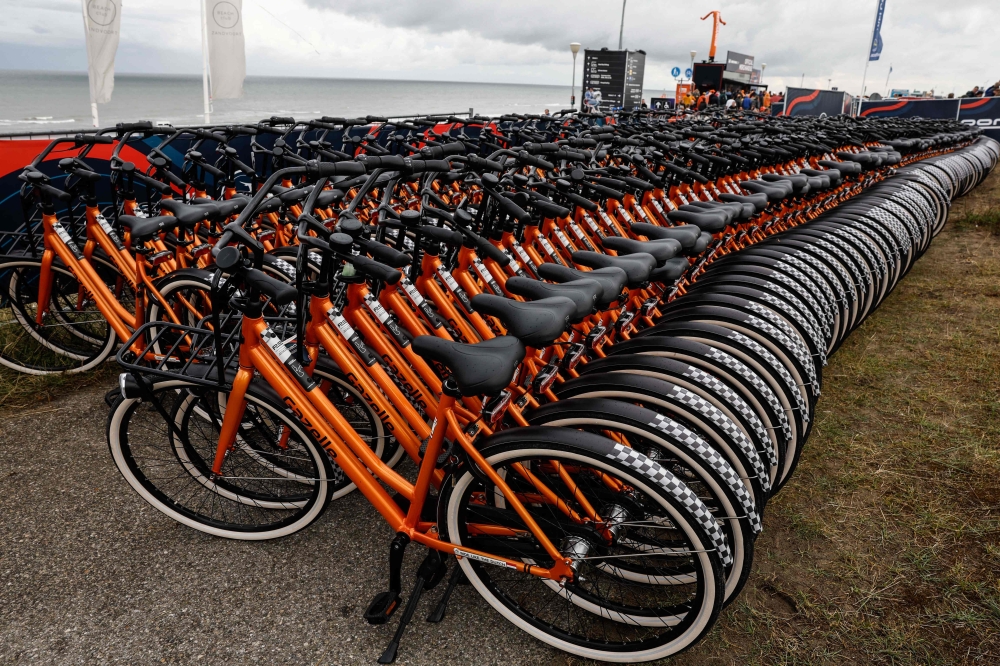 This photograph taken on August 27, 2023, shows bicycles set up for fans at the entrance of the Dutch Formula One Grand Prix at The Circuit Zandvoort, in Zandvoort. Photo by Simon Wohlfahrt / AFP