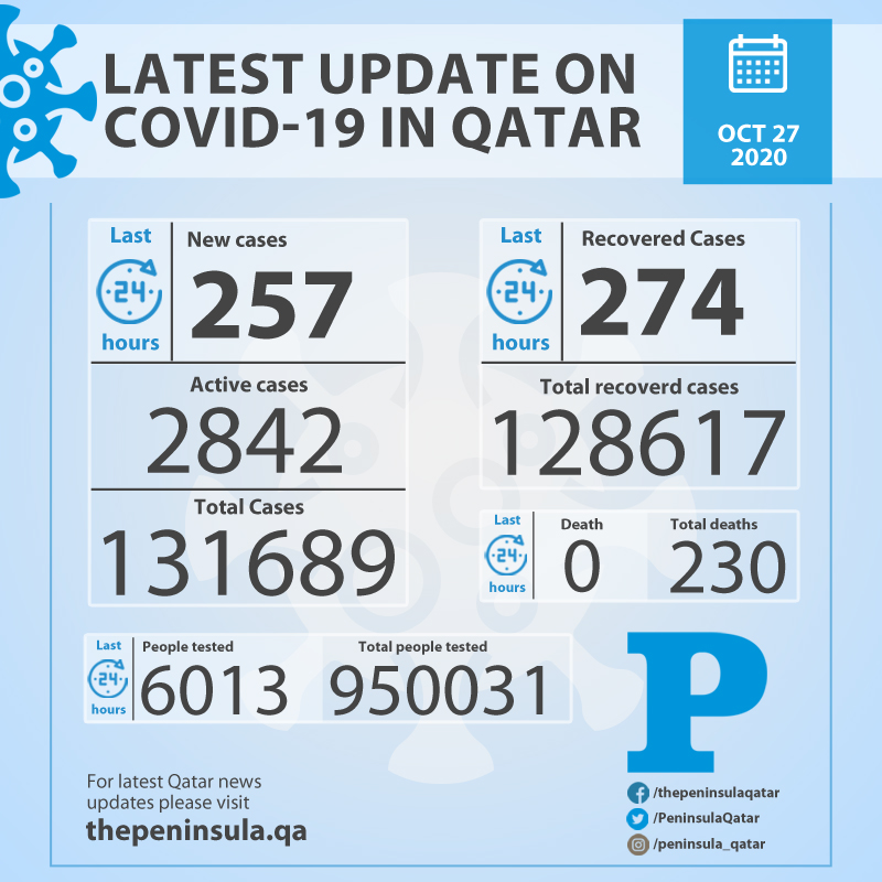 Doha: Ministry of Public Health (MoPH) today recorded 257 new cases of coronavirus (COVID-19) and 274 people recovered from the virus in the last 24 hours, bringing the total number of people recovered in Qatar to 128,617.