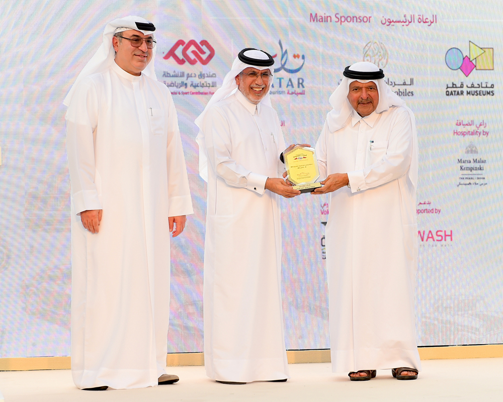 Sheikh Faisal and Omar Al Fardan honouring Deputy CEO of Dar Al Sharq Jaber Al Harmi.