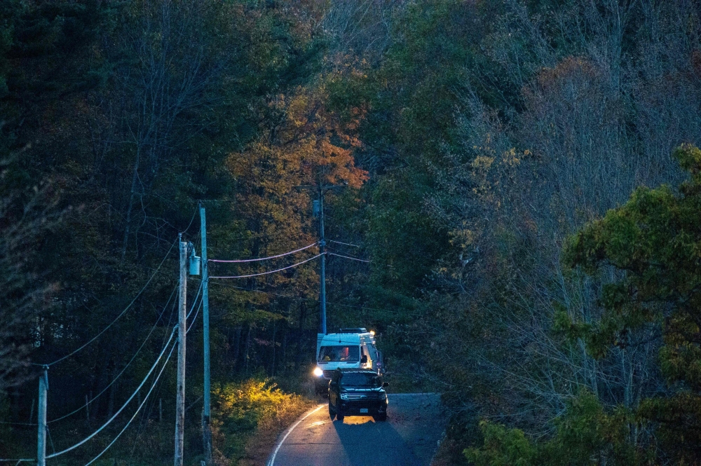 Law enforcement vehicles sit on the road leading to the home of Robert Card's father in Bowdoin, 15 miles (24km) away from Lewiston, Maine on October 26, 2023 the day after a mass shooting. Photo by Joseph Prezioso / AFP