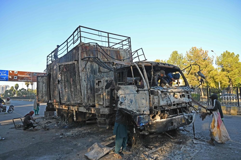 Ragpickers collect scraps from a burnout rally truck used by Bushra Bibi, the wife of Pakistan's former prime minister Imran Khan, near the red zone area after a protest to demand Khan's release, in Islamabad on November 27, 2024. (Photo by Aamir Qureshi / AFP)