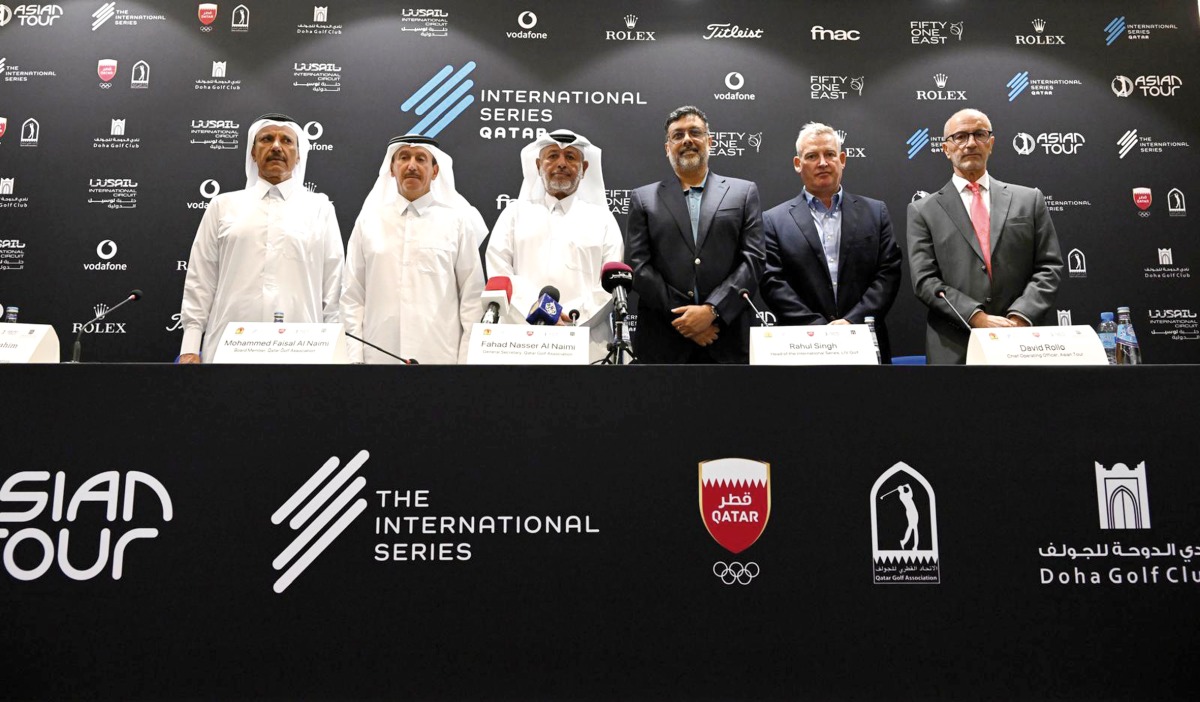 FROM LEFT: Qatar Golf Association (QGA) Board Members Mohammed Ibrahim Al Muhanadi and Mohammed Faisal Al Naimi, QGA General Secretary Fahad Nasser Al Naimi, Head of the International Series Rahul Singh, Asian Tour Chief Operating Officer David Rollo and QGA Technical Expert Mike Shoueiry pose for a photo during a press conference.