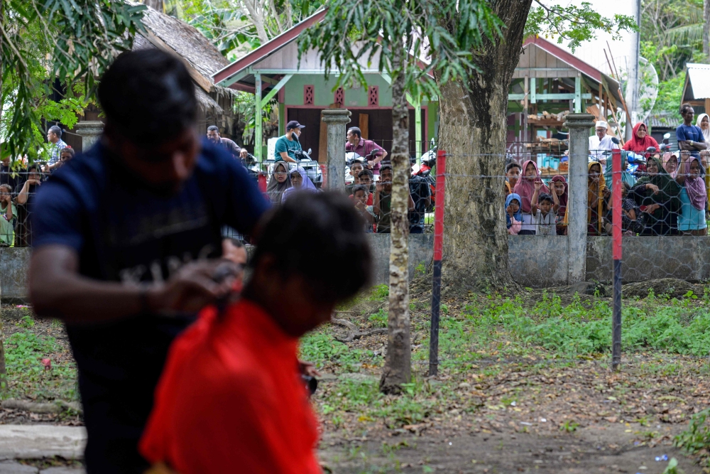 Villagers watch a Rohingya refugee getting his haircut at a temporary shelter after arriving by boat in Laweueng, Aceh province on December 27, 2022. (Photo by Chaideer Mahyuddin / AFP)