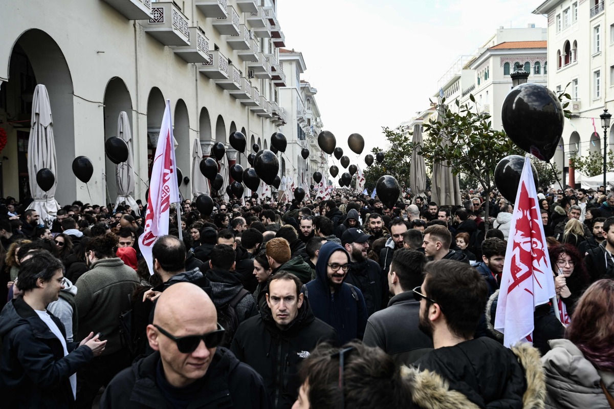 Protesters, some with black balloons, take part in rally during a general strike called by unions to mark the second anniversary of Tempi railway collision in February 2023, in Thessaloniki on February 28, 2025. Photo by Sakis Mitrolidis / AFP
