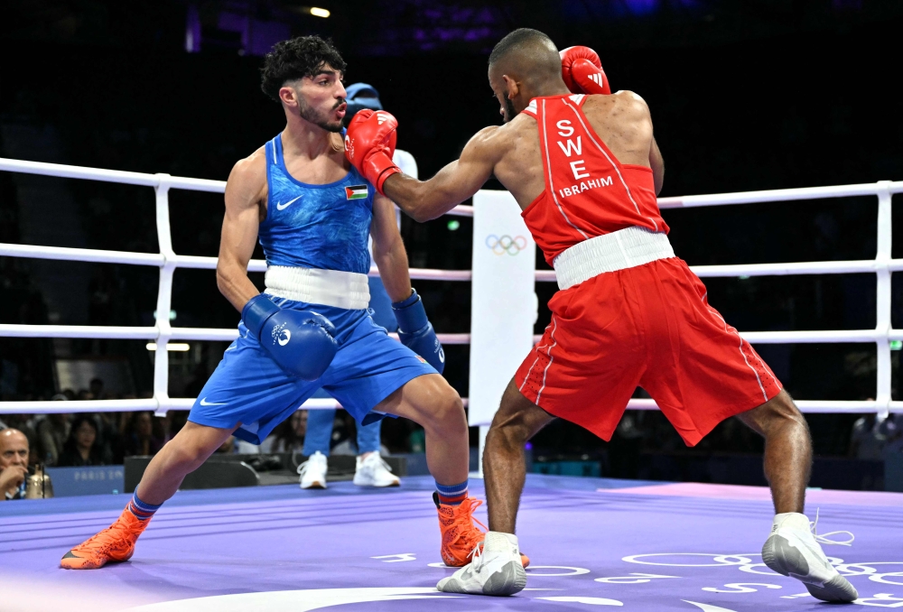 Palestinian Wasim Abusal fights against Sweden's Nebil Ibrahim in the men's 57kg preliminaries round of 32 boxing match during the Paris 2024 Olympic Games at the North Paris Arena, in Villepinte on July 28, 2024. (Photo by MOHD RASFAN / AFP)