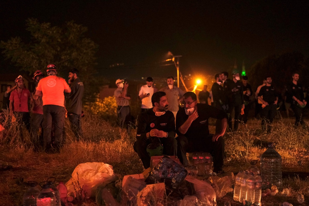 Emergency services and residents rest amid efforts to extinguish a wildfire in a forested area in the Gursu district of Bursa early on July 27, 2025. (Photo by ONUR YURTSEVER / AFP)