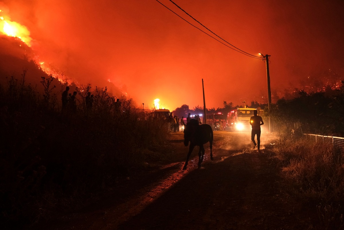 A horse gallops past residents and firefighters attempting to extinguish a wildfire in a forested area in the Gursu district of Bursa early on July 27, 2025. (Photo by ONUR YURTSEVER / AFP)
