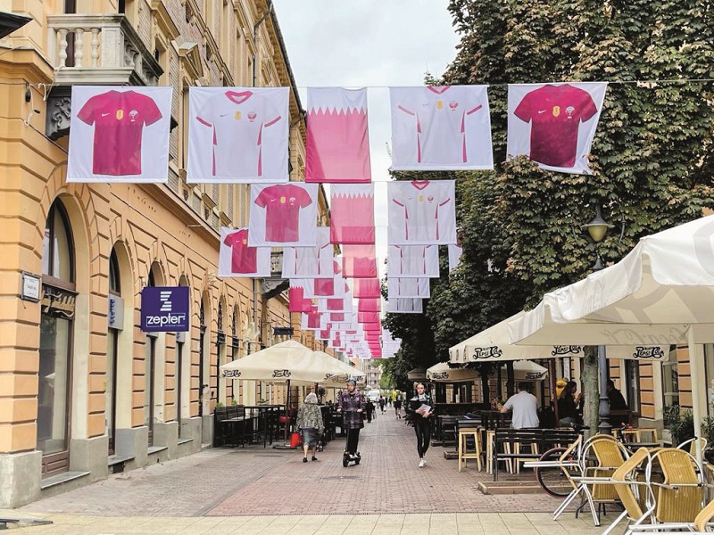 Streets and public places in Debrecen, Hungary, decorated with promotional campaign for the Qatar national football team ahead of the European qualifiers for the FIFA World Cup Qatar 2022.