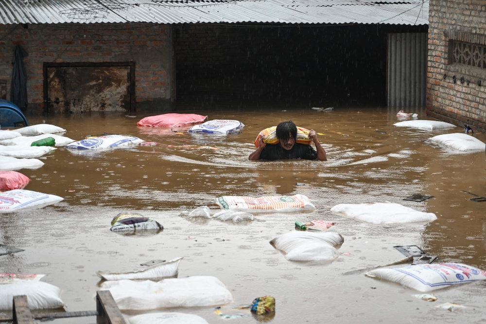 A man carrying a sack of flour from his shop wades through flood waters after the Bagmati river overflowed in Kathmandu on September 28, 2024. (Photo by Prakash Mathema / AFP)