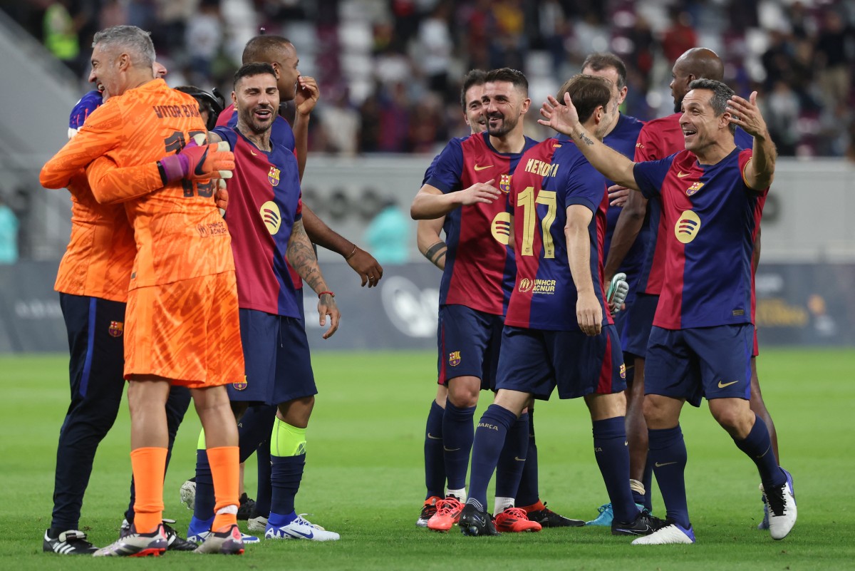 Barcelona's legends celebrate winning the Legends El Clasico football match between Real Madrid and Barcelona at the Khalifa International Stadium in Al-Rayyan on November 28, 2024. (Photo by KARIM JAAFAR / AFP)