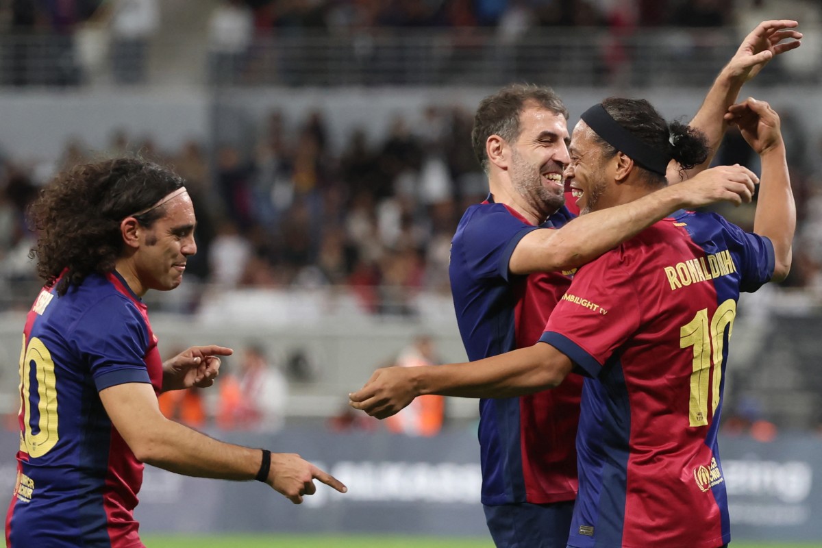 Barcelona's Brazilian forward Ronaldinho celebrates with teammates after scoring a goal during the Legends El Clasico football match between Real Madrid and Barcelona at the Khalifa International Stadium in Al-Rayyan on November 28, 2024. (Photo by KARIM JAAFAR / AFP)