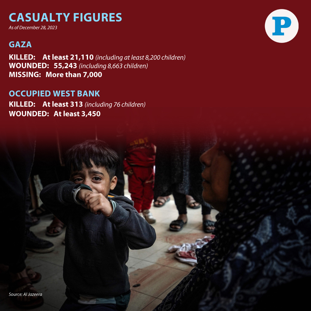 In Gaza, the number of Palestinians killed has reached 21, 110 while 55,243 are injured, and over 7,000 people are declared missing.