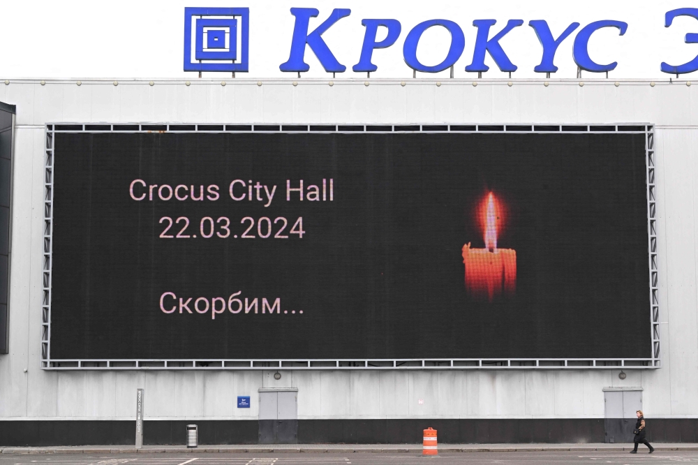A woman walks past an advertising screen displaying an image of a lit candle and text reading "Crocus City Hall 22 03 2024 (We) Mourn..." on the facade of the Crocus City Hall in Moscow's northern suburb of Krasnogorsk on March 29, 2024. (Photo by Natalia Kolesnikova / AFP)