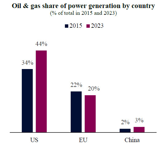 Oil and gas share of power generation by country (% of total in 2015 and 2023)