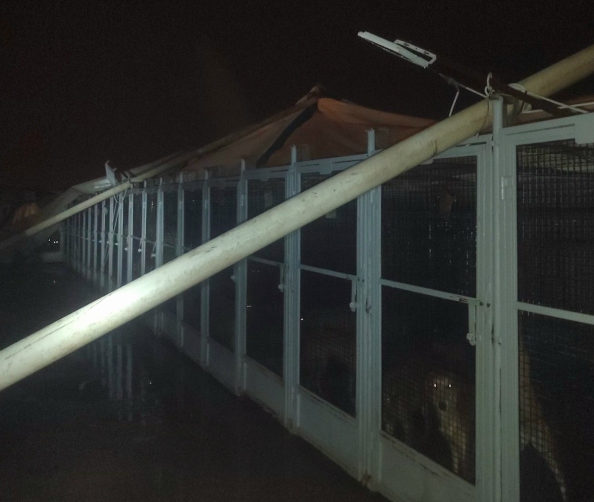 Metal roofing was torn apart, drainage systems failed, and fallen trees added to the damage. At the time, the shelter was caring for more than 190 animals, including over 130 dogs and around 60 cats, forcing the team to act quickly to keep them safe.